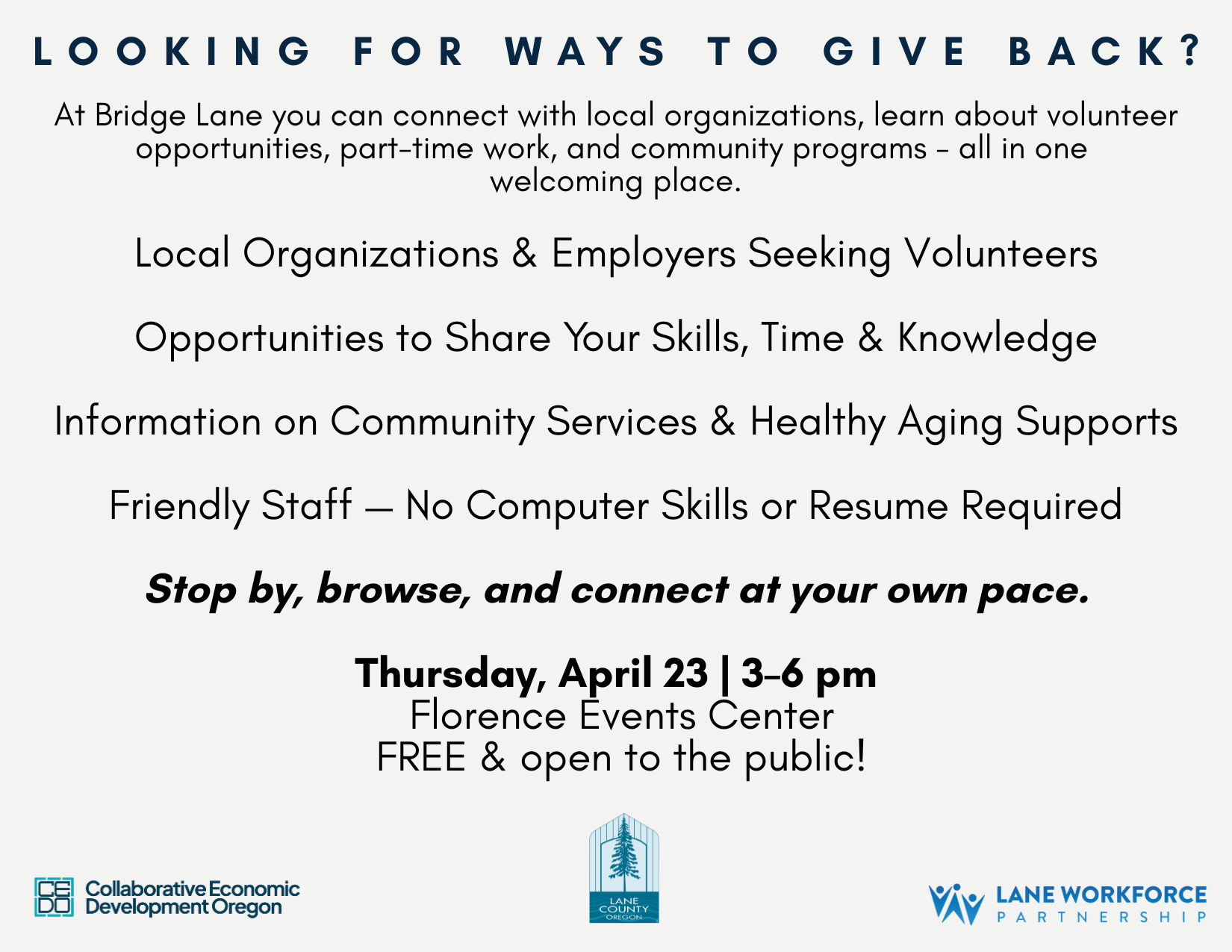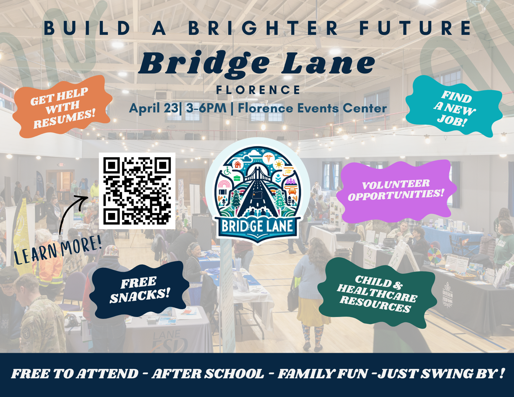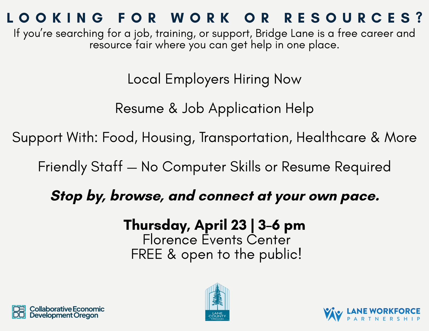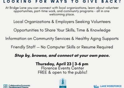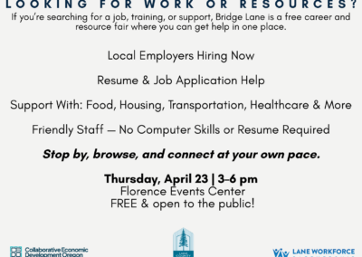 The event will take place Thursday, April 23, from 3:00–6:00 pm at the Florence Events Center. Bridge Lane brings together hiring employers, education and workforce training providers, and community resource organizations to help individuals and families take the next step toward stability and opportunity. Attendees can explore job openings, learn about training programs, and connect with services supporting housing, food, childcare, healthcare, transportation, technology, and more.