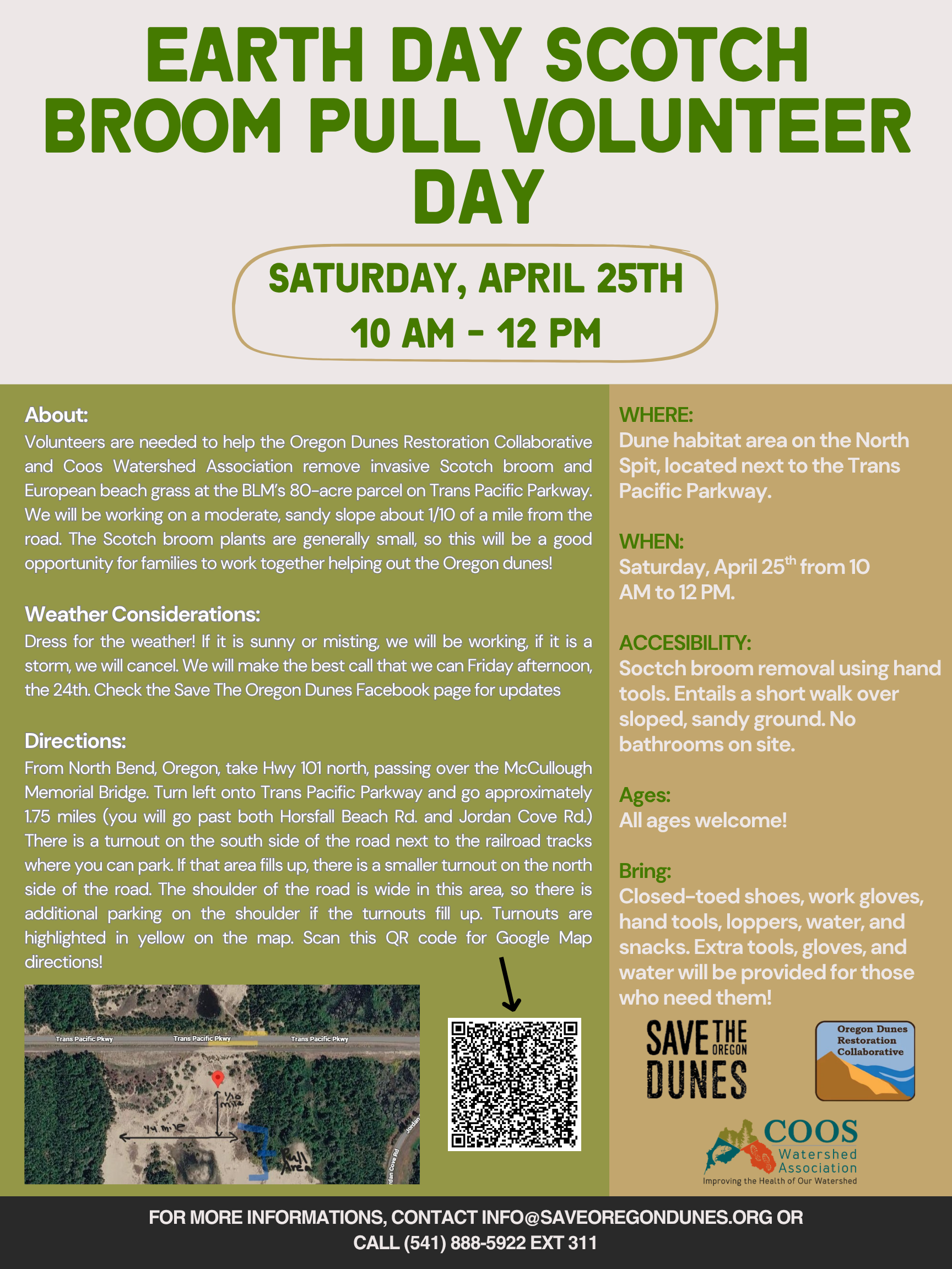 Oregon Dunes Restoration Collaborative logo with sand dune and oceanCelebrate Earth Day by volunteering with the Oregon Dunes Restoration Collaborative and Coos Watershed Association to remove invasive Scotch broom and European beach grass at the BLM’s 80-acre parcel on Trans Pacific Parkway on Saturday, April 25 from 10 AM to Noon. We will be working on a moderate, sandy slope about 1/10 of a mile from the road. Bring closed-toe shoes, work gloves, water, and snacks. Please bring shovels or loppers if you have them. If you don’t, ODRC will have tools you can borrow. The Scotch broom plants are generally small, so this will be a good opportunity for families to work together helping out the Oregon dunes!